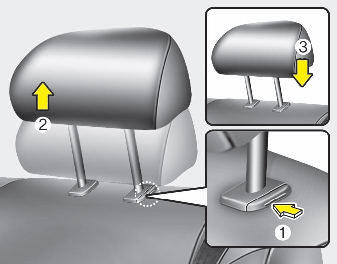 To raise the headrest, pull it up (1). To lower the headrest, push and hold the release button (2) on the headrest support and lower the headrest (3).